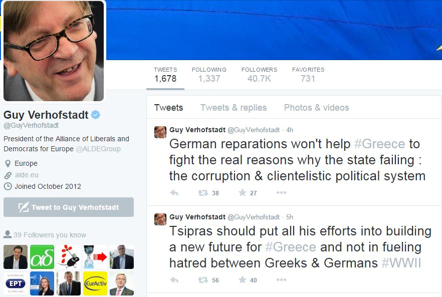«Ο Τσίπρας θα πρέπει να θέσει τις προσπάθειές του στο να χτίσει ένα νέο μέλλον για την Ελλάδα, και όχι να πυροδοτεί το μίσος μεταξύ των Ελλήνων και των Γερμανών», έγραψε στον προσωπικό του λογαριασμό στο Twitter, ο πρόεδρος των Φιλελευθέρων στο Ευρωπαϊκό Κοινοβούλιο, Γκι Φερχόφστατ, γράφοντας το hashtag WWII, αναφερόμενος στις γερμανικές επανορθώσεις.
