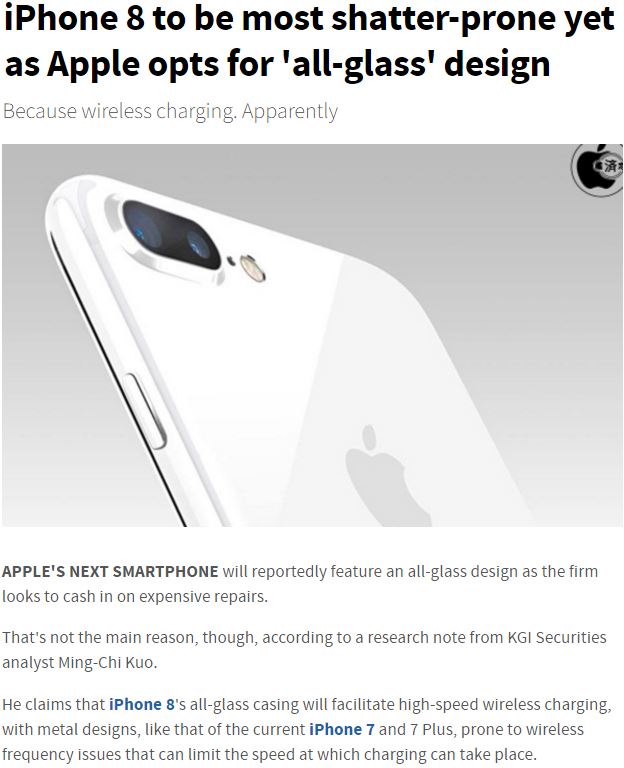 «Πιστεύουμε ότι ένας από τους λόγους για τους οποίους τα νέα iPhone θα διαθέτουν γυάλινο και όχι μεταλλικό περίβλημα, είναι για να υποστηρίζεται πιο αποτελεσματικά η ασύρματη φόρτιση», δήλωσε στην Inquirer ο αναλυτής της εταιρείας KGI Securities, Μινγκ-Τσι Κούο.