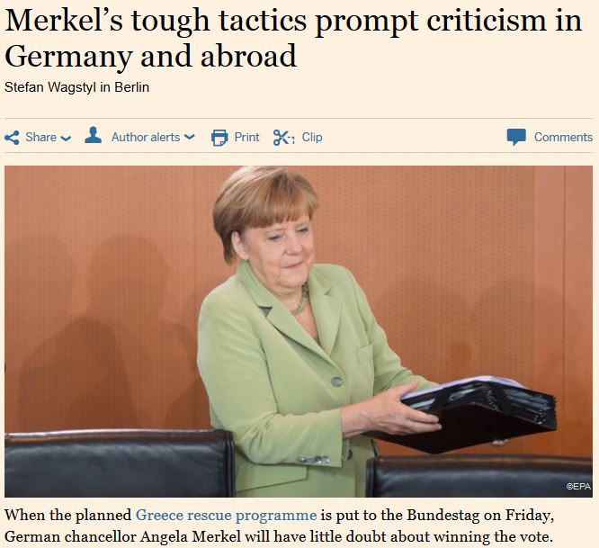 Η σκληρή τακτική της γερμανίδας καγκελαρίου Α. Μέρκελ απέναντι στο ελληνικό ζήτημα ανάβει την κριτική τόσο στη Γερμανία όσο και στο εξωτερικό, γράφουν οι Financial Times.