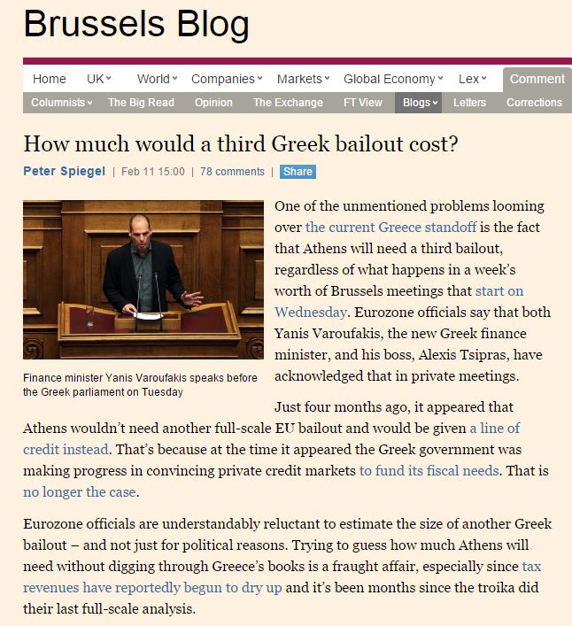 Η Ελλάδα θα χρειαστεί και τρίτο πακέτο διάσωσης λέει με σιγουριά σε άρθρο του στους Financial Times ο Peter Spiegel, «ανεξάρτητα από το τι θα συμβεί στις συναντήσεις των Βρυξελλών». Επικαλείται, μάλιστα, αξιωματούχους της Ευρωζώνης οι οποίοι λένε ότι τόσο ο Γιάννης Βαρουφάκης όσο και ο Αλέξης Τσίπρας έχουν αναγνωρίσει την ανάγκη αυτή σε κατ’ ιδίαν συναντήσεις τους.