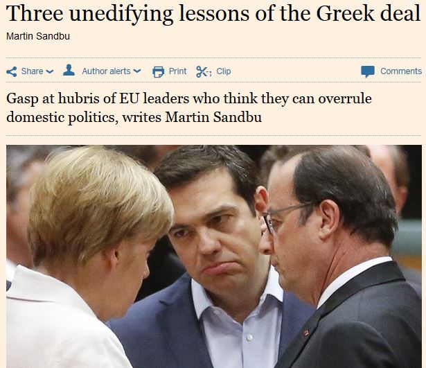 Ακόμα διαρρέουν οι λεπτομέρειες της πολιτικής συμφωνίας που επιτεύχθηκε χτες μετά από μία ολονύχτια σύνοδο κορυφής της ευρωζώνης και υπάρχουν πολλές ακόμα αποφάσεις που εκκρεμούν για τις επόμενες μέρες. Αλλά μπορούμε ήδη να αντλήσουμε τρία διδάγματα. Και κανένα δεν είναι ιδιαίτερα εποικοδομητικό.