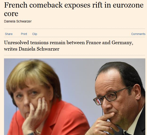 Αυτές οι κινήσεις ήταν αξιοσημείωτες. Μέχρι τώρα το Παρίσι σε μεγάλο βαθμό –αν και απρόθυμα- ακολουθούσε σιωπηλά την πολιτική του Βερολίνου για την ευρωζώνη σε ότι αφορά την παροχή βοήθειας, όμως την ίδια ώρα πίεζε σκληρά για μεταρρυθμίσεις στη διακυβέρνηση της ευρωζώνης οι οποίες ακολουθούν το γερμανικό οικονομικό σκεπτικό. Τώρα, αντιτιθέμενο στην θέση του Βερολίνου ως προς το πώς να αντιμετωπιστεί το ελληνικό ζήτημα, το Παρίσι έχει φέρει στην επιφάνεια ένα βαθύ ρήγμα στην ευρωζώνη που αφορά την ίδια τη φύση της νομισματικής ένωσης.