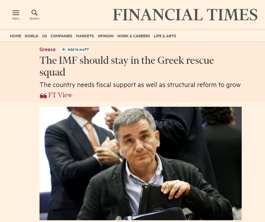 Το Διεθνές Νομισματικό Ταμείο έχει δίκιο, όταν τονίζει ότι η Ελλάδα χρειάζεται ελάφρυνση του χρέους της και μικρότερη δημοσιονομική προσαρμογή, αναφέρουν οι Financial Times σε άρθρο γνώμης τους, με τίτλο: «Το ΔΝΤ πρέπει να μείνει στην ελληνική ομάδα διάσωσης».