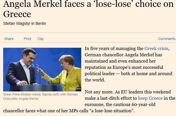 Όχι πια. Την ώρα που οι ηγέτες της Ε.Ε. κάνουν αυτό το Σαββατοκύριακο μια τελευταία προσπάθεια να κρατήσουν την Ελλάδα στην ευρωζώνη, η προσεκτική 60χρονη καγκελάριος είναι αντιμέτωπη με αυτό που ένας από τους βουλευτές της αποκαλεί κατάσταση «lose-lose».