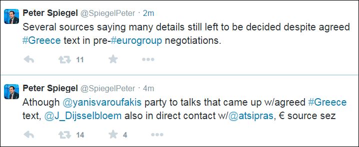 Υπάρχουν πολλές λεπτομέρειες που πρέπει ακόμη να συμφωνηθούν, παρά τη συμφωνία επί ενός κειμένου, κατά τις συνομιλίες πριν από την έναρξη του Eurogroup, γράφει στο Twitter ο επικεφαλής του γραφείου των Financial Times στις Βρυξέλλες Peter Spiegel.