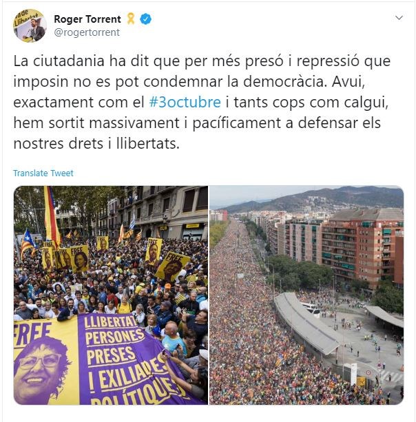 Σύμφωνα με την αστυνομία, περίπου 525.000 άνθρωποι κατέκλυσαν τους δρόμους της Βαρκελώνης για να διαμαρτυρηθούν για την καταδίκη των Καταλανών αυτονομιστών ηγετών σε βαριές ποινές κάθειρξης από την ισπανική δικαιοσύνη για τον ρόλο τους στην απόπειρα απόσχισης το 2017.