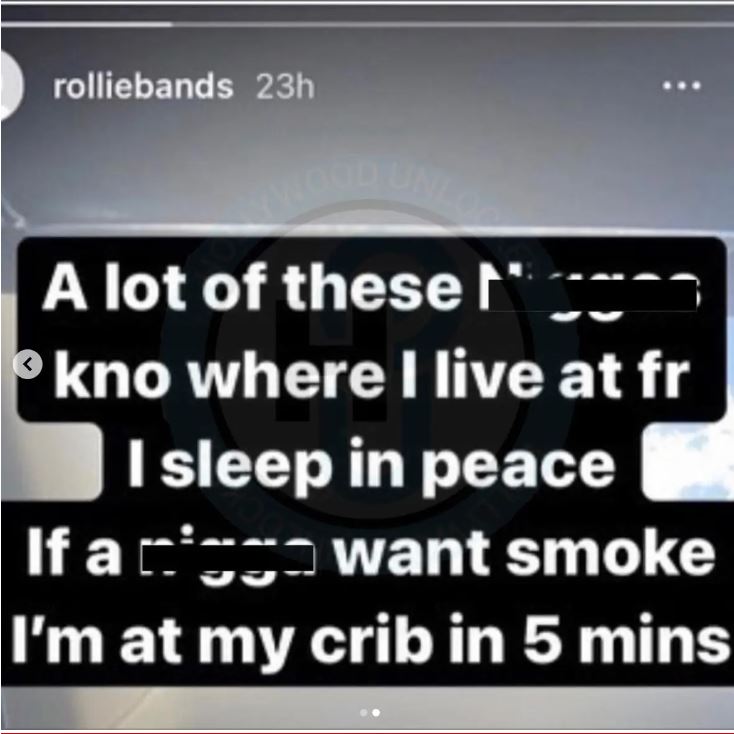 “Πολλοί από αυτούς τους n****s ξέρουν πού μένω στο #@#@”, έγραψε ο ράπερ στην ιστορία του στο Instagram, σύμφωνα με το HipHopDX. «Κοιμάμαι ήσυχος. Αν κάποιος θέλει, είμαι στην κούνια μου σε 5 λεπτά».