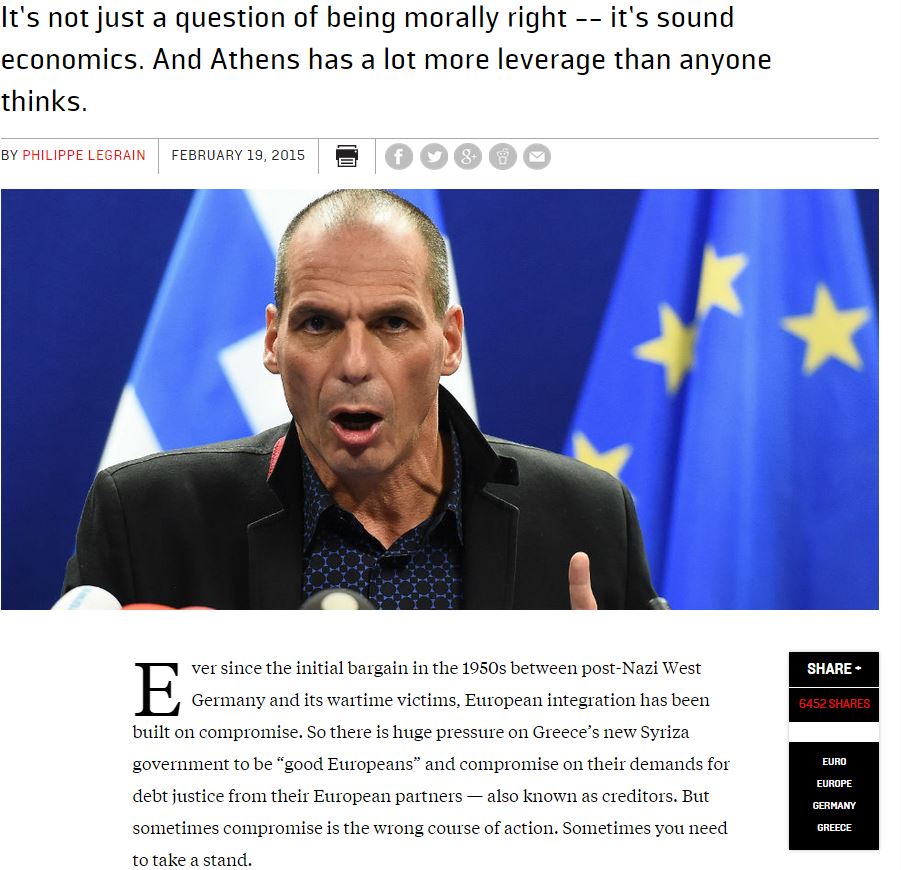 Ο αρθρογράφος κρίνει «εντελώς λογικό το σχέδιο τεσσάρων σημείων που πρότεινε ο Έλληνας υπουργός Οικονομικών, Γιάνης Βαρουφάκης, το οποίο περιλαμβάνει ένα μικρότερο δημοσιονομικό πλεόνασμα, στο 1,5% σε σχέση με το ΑΕΠ, αντί του 3 ή 4,5%, ώστε να μπορέσουν να χρησιμοποιηθούν κάποια έσοδα για την αντιμετώπιση της ανθρωπιστικής κρίσης. Το υπέρογκο επίσης χρέος της χώρας θα μπορούσε να ελαφρυνθεί με την ανταλλαγή των δανείων από τις κυβερνήσεις της ευρωζώνης με χρεόγραφα που θα συνδέονται με τα ποσοστό ανάπτυξης του ελληνικού ΑΕΠ».