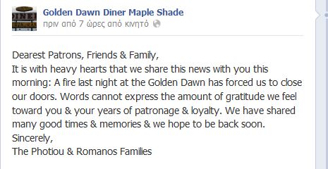 “Μια φωτιά χτες τη νύχτα μας ανάγκασε να κλείσουμε. Οι λέξεις δεν αρκούν για να εκφράσουν την ευγνωμοσύνη που νοιώθουμε για εσάς και για τα χρόνια που ήσασταν πιστοί μας πελάτες. Μοιραστήκαμε πολλές καλές στιγμές και αναμνήσεις και ελπίζουμε σύντομα να επιστρέψουμε”.
