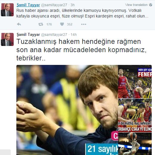 Σάλο προκάλεσε η ανάρτηση στο twitter του Τούρκου βουλευτή Σαμίλ Ταγιάρ, μετά την ήττα της Φενέρμπαχτσε από την ΤΣΣΚΑ Μόσχας .