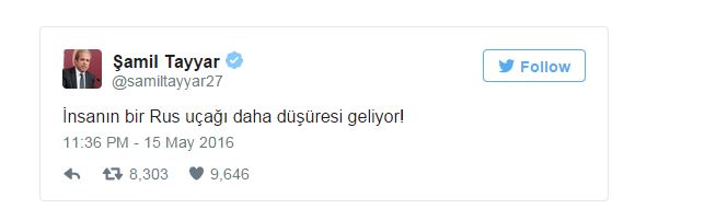 “Θα ήθελα να ρίξουμε ξανά ένα ρωσικό αεροπλάνο”, έγραψε ο Ταγιάρ που είναι βουλευτής του κυβερνώντος Κόμματος Δικαιοσύνης και Ανάπτυξης (AKP).