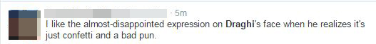 “Μου αρέσει η σχεδόν-απογοήτευσης έκφραση στο πρόσωπο του Ντράγκι μόλις συνειδητοποιεί ότι είναι απλά κομφετί και ένα κακό λογοπαίγνιο“
