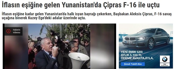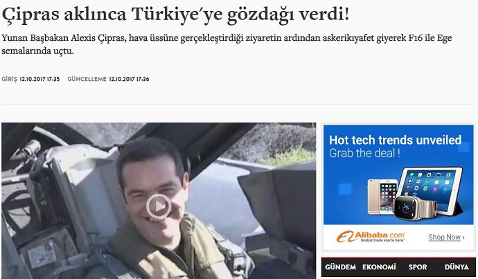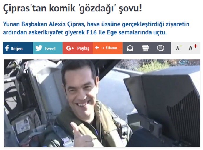 Εκτενείς αναφορές στην πτήση με F-16 του Αλέξη Τσίπρα πάνω από το βόρειο Αιγαίο κάνουν τα περισσότερα μέσα ενημέρωσης στην Τουρκία, όπως μεταδίδει η ανταποκρίτρια του ΑΝΤ1 στη γειτονική χώρα, Μαρία Ζαχαράκη.Υπογραμμίζουν ότι είναι ο τρίτος Πρωθυπουργός της Ελλάδας, μετά τον Ελευθέριο Βενιζέλο και τον Κωνσταντίνο Μητσοτάκη, που πετάει με αεροσκάφος της Πολεμικής Αεροπορίας, ενώ αρκετά ρεπορτάζ σχολιάζουν το θέμα σκωπτικά.Ενδεικτικά η εφημερίδα Sabah διερωτάται εάν πρόκειται για “σόου ή πρόκληση”.Το φιλοκυβερνητικό δίκτυο Haber 7 μεταδίδει πως «ο Τσίπρας νομίζει ότι απειλεί έτσι την Τουρκία».
