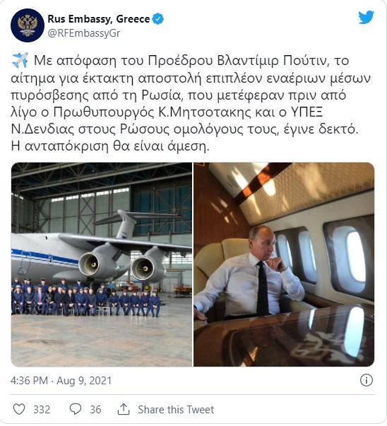 «Με απόφαση του προέδρου Βλαντιμίρ Πούτιν, το αίτημα για έκτακτη αποστολή επιπλέον εναέριων μέσων πυρόσβεσης από τη Ρωσία, που μετέφεραν πριν από λίγο ο πρωθυπουργός Κυριάκος Μητσοτακης και ο ΥΠΕΞ Νίκος Δενδιας στους Ρώσους ομολόγους τους, έγινε δεκτό», αναφέρει στο tweet της η ρωσική πρεσβεία και συμπληρώνει: «Η ανταπόκριση θα είναι άμεση».
