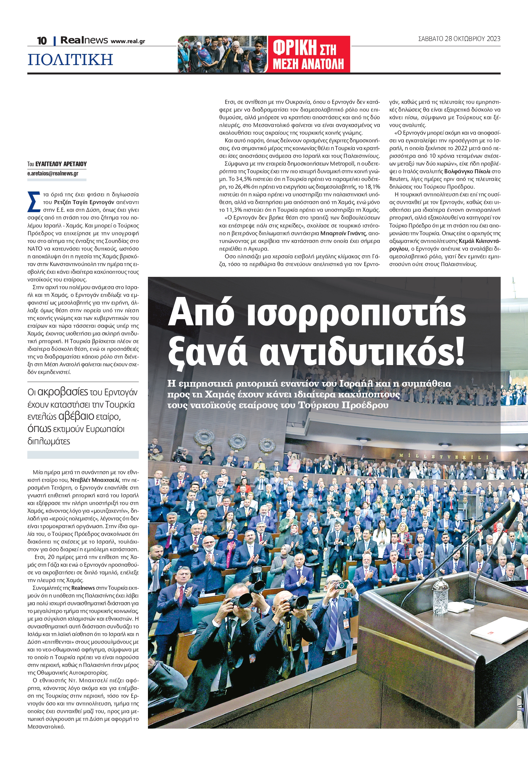 Σύμφωνα με την εταιρεία δημοσκοπήσεων Metropoll, η ουδετερότητα της Τουρκίας έχει την πιο ισχυρή δυναμική στην κοινή γνώμη. Το 34,5% πιστεύει ότι η Τουρκία πρέπει να παραμείνει ουδέτερη, το 26,4% ότι πρέπει να ενεργήσει ως διαμεσολαβητής, το 18,1% πιστεύει ότι η χώρα πρέπει να υποστηρίξει την παλαιστινιακή υπόθεση, αλλά να διατηρήσει μια απόσταση από τη Χαμάς, ενώ μόνο το 11,3% πιστεύει ότι η Τουρκία πρέπει να υποστηρίξει τη Χαμάς. «Ο Ερντογάν δεν βρήκε θέση στο τραπέζι των διαβουλεύσεων και επέστρεψε πάλι στις κερκίδες», σχολίασε σε τουρκικό ιστότοπο η βετεράνος διπλωματική συντάκτρια Μπαρτσίν Γινάντς, αποτυπώνοντας με ακρίβεια την κατάσταση στην οποία έχει σήμερα περιέλθει η Αγκυρα. Οσο πλησιάζει μια χερσαία εισβολή μεγάλης κλίμακας στη Γάζα, τόσο τα περιθώρια θα στενεύουν απελπιστικά για τον Ερντογάν, καθώς μετά τις τελευταίες του εμπρηστικές δηλώσεις θα είναι εξαιρετικά δύσκολο να κάνει πίσω, σύμφωνα με Τούρκους και ξένους αναλυτές.