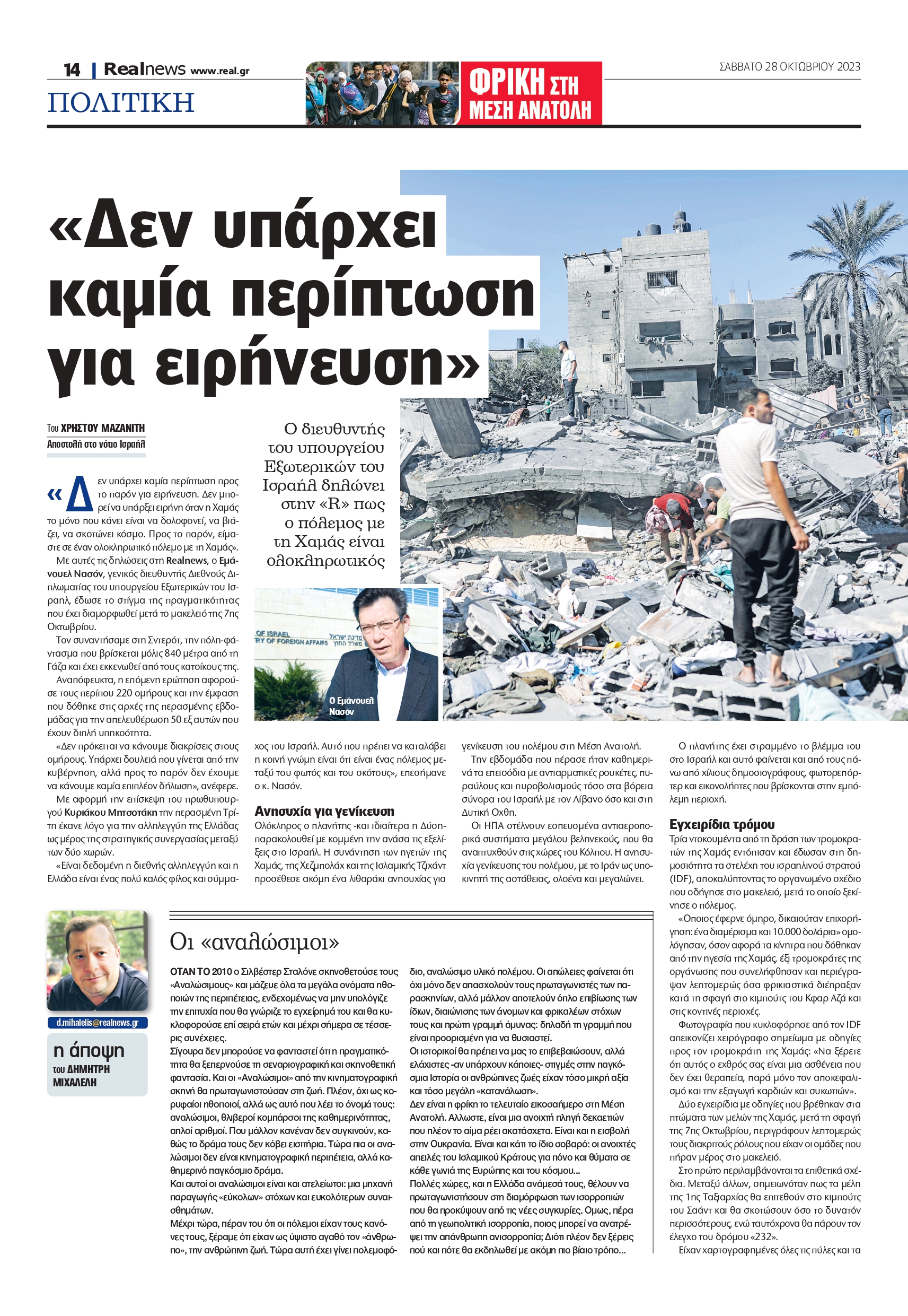 «Δεν υπάρχει καμία περίπτωση προς το παρόν για ειρήνευση. Δεν μπορεί να υπάρξει ειρήνη όταν η Χαμάς το μόνο που κάνει είναι να δολοφονεί, να βιάζει, να σκοτώνει κόσμο. Προς το παρόν, είμαστε σε έναν ολοκληρωτικό πόλεμο με τη Χαμάς». Με αυτές τις δηλώσεις στη Realnews, ο Εμάνουελ Νασόν, γενικός διευθυντής Διεθνούς Διπλωματίας του υπουργείου Εξωτερικών του Ισραηλ, έδωσε το στίγμα της πραγματικότητας που έχει διαμορφωθεί μετά το μακελειό της 7ης Οκτωβρίου.