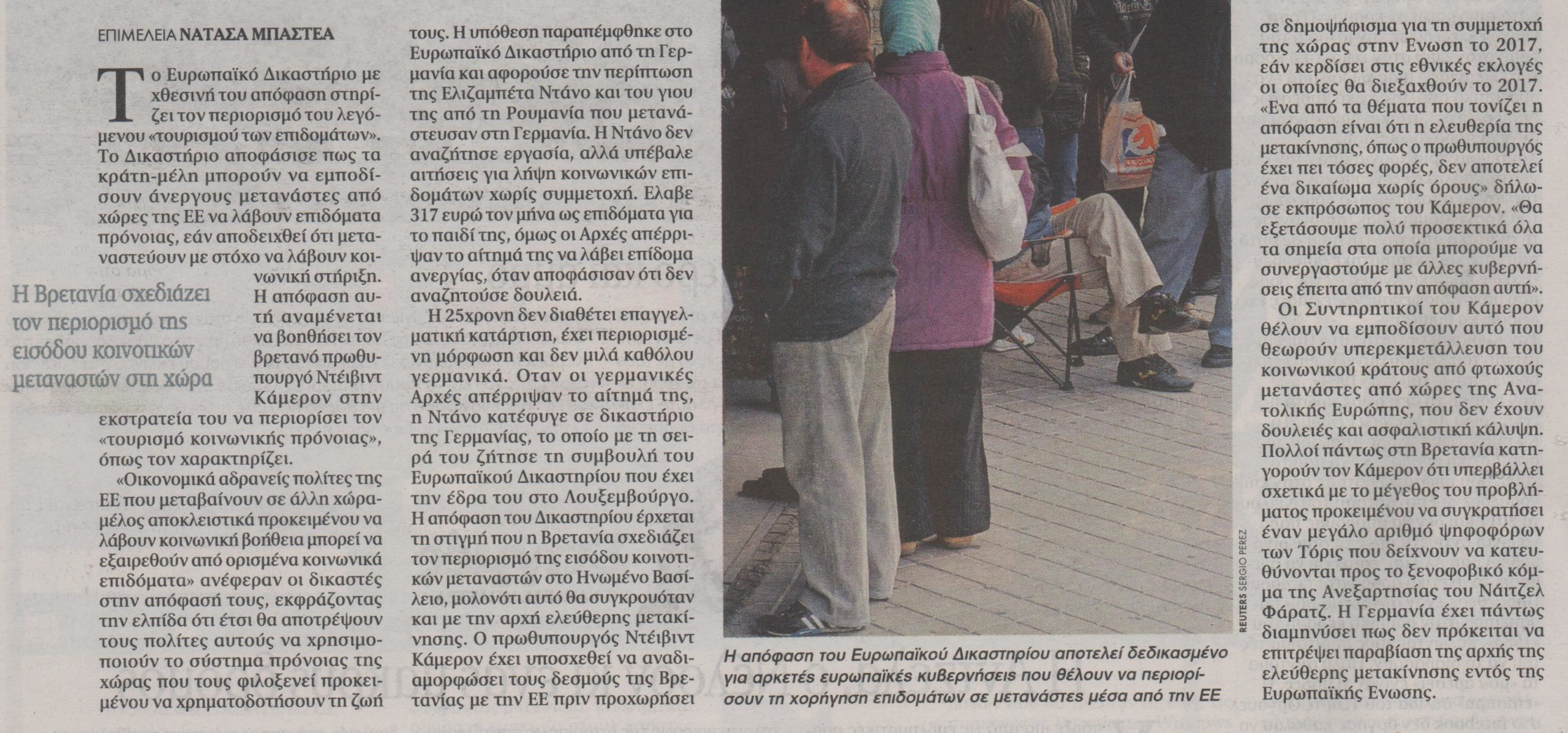 Το Ευρωπαϊκό Δικαστήριο με χθεσινή του απόφαση στηρίζει τον περιορισμό του λεγόμενου «τουρισμού των επιδομάτων». Το Δικαστήριο αποφάσισε πως τα κράτη-μέλη μπορούν να εμποδίσουν άνεργους μετανάστες από χώρες της Ε.Ε. να λάβουν επιδόματα πρόνοιας, εάν αποδειχθεί ότι μεταναστεύουν με στόχο να λάβουν κοινωνική υποστήριξη.