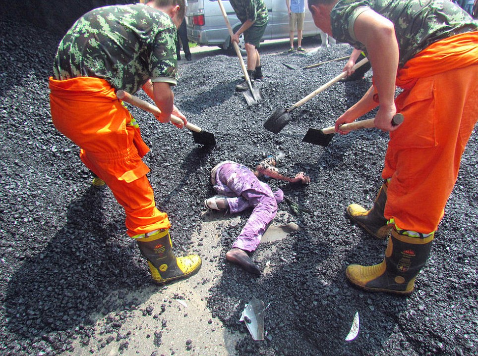 Δέκα τόνοι καυτής πίσσας καταπλάκωσαν έναν οδηγό σκούτερ, σε ένα φρικιαστικό τροχαίο στην Κίνα.Ο οδηγός του σκούτερ κινούνταν στο δρόμο όταν «πετάχτηκε» ξαφνικά μπροστά από το φορτηγό, το οποίο παρά τις προσπάθειες να το αποφύγει τελικά ντεραπάρισε καταπλακώνοντας τον άτυχο μοτοσικλετιστή με το καυτό υγρό.