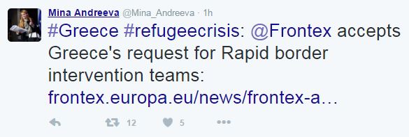 Την αποδοχή από τη Frontex του αιτήματος της Ελλάδας για ενεργοποίηση των Ομάδων Άμεσης Παρέμβασης (RABIT), ανακοίνωσε μέσω Twitter η αναπληρώτρια εκπρόσωπος της Ευρωπαϊκής Επιτροπής, Μίνα Αντρέεβα.