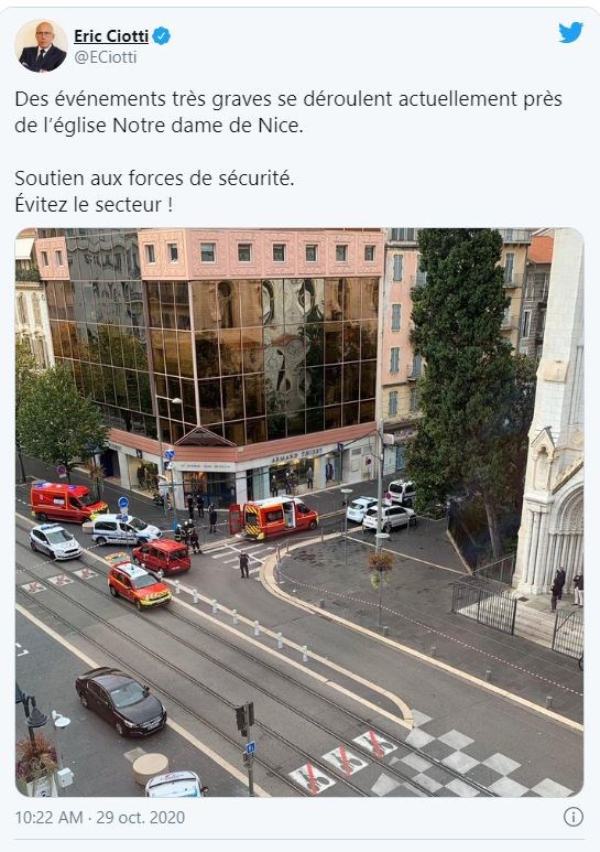 Σύμφωνα με τα γαλλικά Μέσα αρκετοί είναι οι τραυματίες της επίθεσης που σημειώθηκε γύρω στις 9.00 τοπική ώρα. Ο δήμαρχος έγραψε στο twitter ότι η δημοτική αστυνομία συνέλαβε τον δράστη ενώ έχει δημιουργηθεί περίμετρος ασφαλείας γύρω από την εκκλησία που βρίσκεται στο κέντρο της πόλης.
