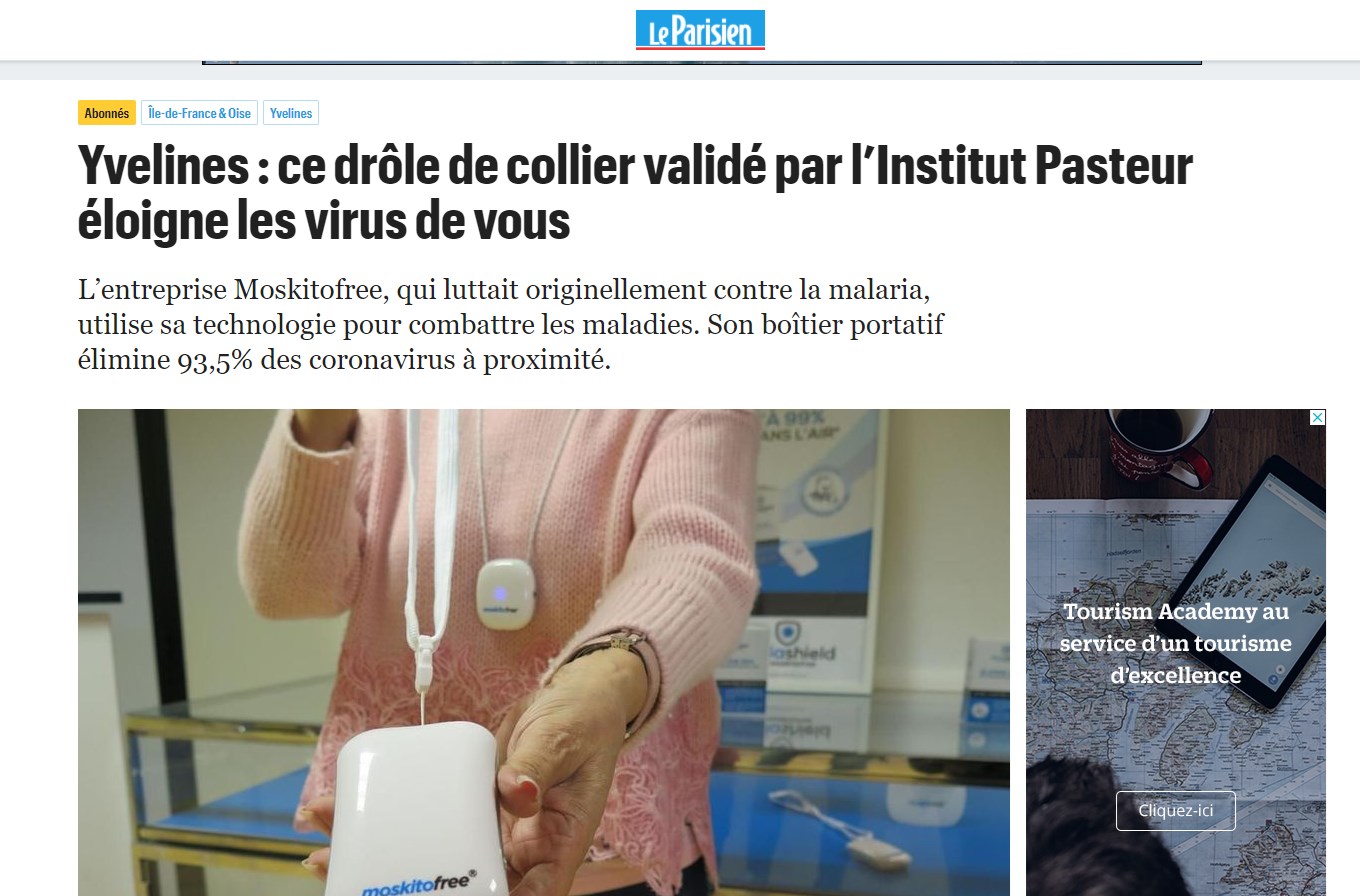 Η εταιρεία Moskitofree, που εξειδικεύεται στην καταπολέμηση της ελονοσίας ανέπτυξε μια τεχνολογία που επιτρέπει την προστασία από τον κορονοϊό που αιωρείται στον αέρα. Πρόκειται για μια μικροσκοπική συσκευή που τοποθετείται στον λαιμό και έχει τη δυνατότητα να σκοτώσει τον κορονοϊό που βρίσκεται ολόγυρα, αναφέρει η εφημερίδα Le Parisien.