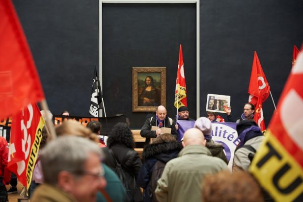 Την πρωτοβουλία είχε το Τμήμα Πολιτισμού της CGT (Γενική Συνομοσπονδία Εργαζομένων) μέλη της οποίας στάθηκαν μπροστά στον διάσημο πίνακα του Ντα Βίντσι με τις σημαίες τους και φώναξαν συνθήματα, ενώ στη συνέχεια ανάρτησαν το βίντεο στο Twitter.