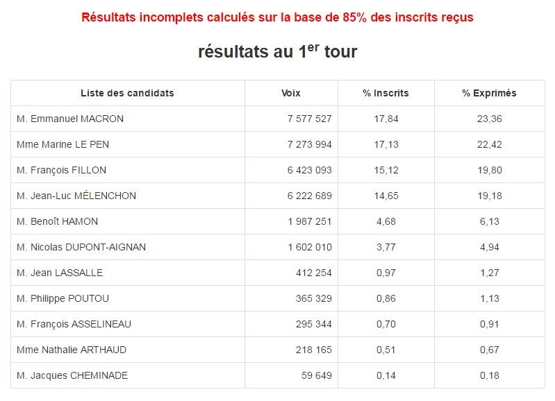 Σύμφωνα με τα αποτελέσματα της καταμέτρησης του υπουργείου Εσωτερικών της Γαλλίας, τα οποία δημοσιεύονται σε πραγματικό χρόνο, στο 85% της καταμέτρησης επί των εγγεγραμμένων ψηφοφόρων, ο Μακρόν συγκεντρώνει το 23,36% των ψήφων, ενώ η Λεπέν λαμβάνει το 22,42%.Ο υποψήφιος των Γάλλων Ρεπουμπλικανών Φρανσουά Φιγιόν ακολουθεί με 19,80%. Αν και αρχικά φερόταν να ισοψηφεί με τον Φιγιόν, ο αριστερός υποψήφιος Ζαν – Λικ Μελανσόν τοποθετείται στο 19,18%. Ο Σοσιαλιστής Μπενουά Αμόν συγκεντρώνει το 6,13%.Πρόκειται για την πρώτη φορά στη σύγχρονη γαλλική ιστορία, που κανένα από τα μεγαλύτερα κόμματα δεν βλέπει τον υποψήφιό του να περνά στο β’ γύρο.