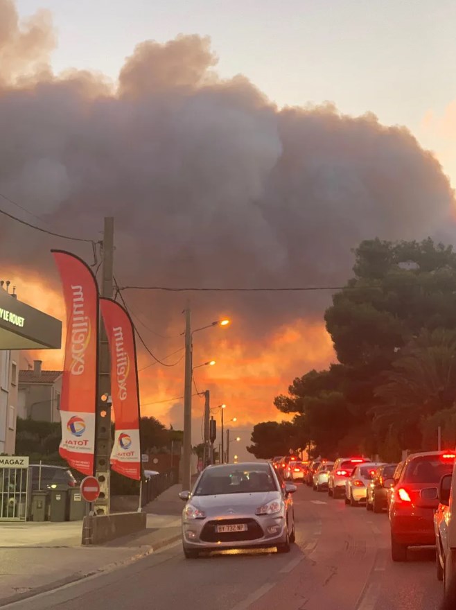 Οι τουρίστες που παραθερίζουν σε τρία κάμπινγκ στην Κουρόν, ένα παραθαλάσσιο προάστιο της κοινότητας Μαρτίγκ, στη νοτιοανατολική Γαλλία, κλήθηκαν να συγκεντρωθούν στην παραλία, καθώς η φωτιά μαίνεται. Μια δημοσιογράφος του Γαλλικού Πρακτορείου που βρισκόταν στην Κουρόν είπε ότι είδε μεγάλα σύννεφα καπνού να υψώνονται στον ουρανό, οι φλόγες είχαν φτάσει στην άκρη του δρόμου ενώ πυροσβεστικά αεροσκάφη έκαναν ρίψεις νερού.
