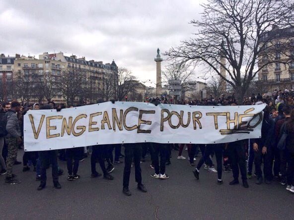 Οι διαδηλωτές διαμαρτύρονταν για τον βιασμό ενός 22χρονου κατά την προσαγωγή του στις 2 Φεβρουαρίου στην περιοχή Ολνέ-σου-Μπουά στο βόρειο Παρίσι όπου ζει μεγάλος αριθμός μεταναστών. Ο άνδρας, που είναι γνωστός ως Τεό, παραμένει στο νοσοκομείο.