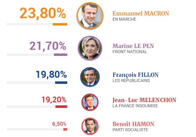 Σύμφωνα με τις πρώτες εκτιμήσεις που δημοσίευσε το γαλλικό τηλεοπτικό δίκτυο France 2, ο Εμμανουέλ Μακρόν προηγείται με 23,8%, ενώ η Μαρίν Λεπέν ακολουθεί με 21, 7%.