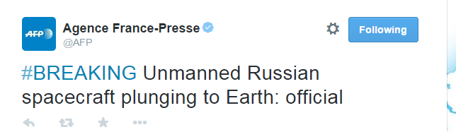 Σύμφωνα με το Γαλλικό πρακτορείο, ένα Ρωσικό, μη επανδρωμένο, διαστημικό σκάφος κατευθύνεται ανεξέλεγκτο προς τη γη.