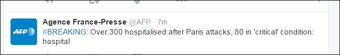 Όπως μετέδωσε πριν από λίγο το Γαλλικό Πρακτορείο περισσότεροι από 300 τραυματίες νοσηλεύονται στα νοσοκομεία μετά από τις τρομοκρατικές επιθέσεις που σημειώθηκαν στο Παρίσι. Από αυτούς οι 80 βρίσκονται σε κρίσιμη κατάσταση.