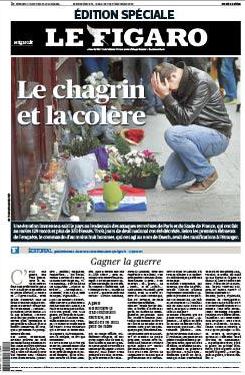 “Η θλίψη και ο θυμός” έχουν κυριεύσει την Le Figaro, η οποία όπως και η Liberation, κυκλοφόρησαν εκτάκτως σήμερα, δύο ημέρες μετά τις αιματηρές τρομοκρατικές επιθέσεις στην γαλλική πρωτεύουσα με τους, σύμφωνα με τα μέχρι στιγμής στοιχεία, 129 νεκρούς, την ευθύνη για τις οποίες ανέλαβε το Ισλαμικό Κράτος.