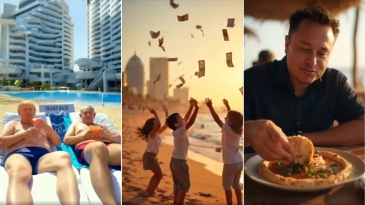 Ουρανοξύστες φιγουράρουν, παιδιά περπατάνε ανέμελα στην παραλία, αυτοκίνητα Tesla κυκλοφορούν στους δρόμους, ο Έλον Μασκ γεύεται παραδοσιακές γεύσεις, μαχητές της Χαμάς χορεύουν φορώντας μπικίνι, ένα παιδί κρατάει ένα χρυσό μπαλόνι με το πρόσωπο του Τραμπ, ο Πρόεδρος των ΗΠΑ χορεύει με μια γυναίκα σε ένα κλαμπ, ένα χρυσό άγαλμά του εμφανίζεται, ο ίδιος και ο Ισραηλινός πρωθυπουργός, Μπενιαμίν Νετανιάχου, απολαμβάνουν χαλαρές στιγμές σε μια πισίνα πίνοντας κοκτέιλ, ενώ η γενικότερη αίσθηση που αφήνει το βίντεο τεχνητής νοημοσύνης είναι ότι… στη Γάζα θα «βρέχει λεφτά».