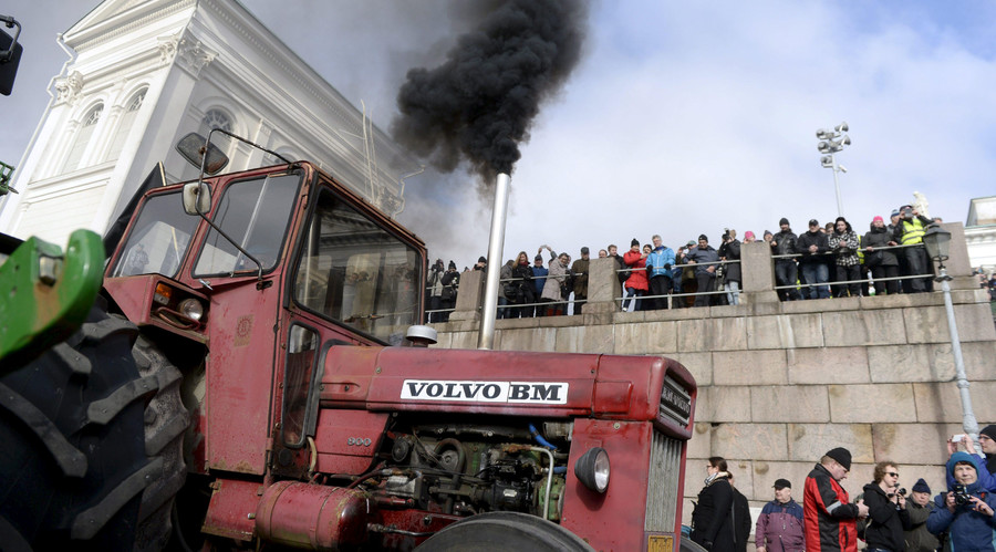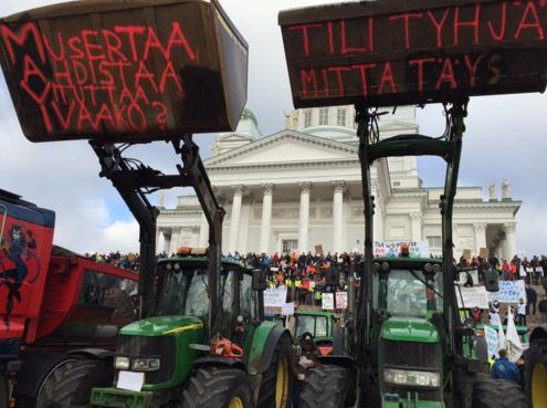 Περισσότεροι από 3.000 αγρότες με τα τρακτέρ τους συγκεντρώθηκαν στην κεντρική πλατεία της πρωτεύουσας της Φινλανδίας, κρατώντας πλακάτ που έγραφαν «όχι αγρότες – όχι φαγητό».