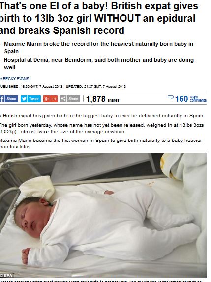 Γεννήθηκε χθες και ζυγίζει 6 κιλά! Η Μαξίμ Μαρίν από την Ισπανία διαθέτει το προνόμιο να είναι η πρώτη γυναίκα στη χώρα της που γέννησε με φυσιολογικό τοκετό το κοριτσάκι της, που έχει το διπλάσιο βάρος από τον μέσο όρο των νεογέννητων.
