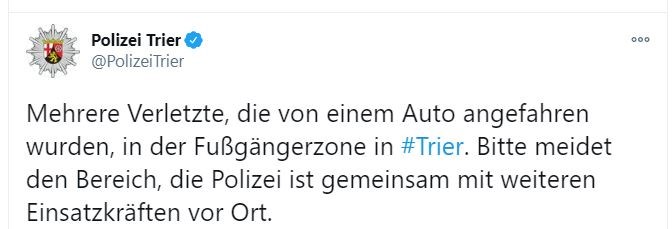Τουλάχιστον τέσσερις νεκροί και 15 τραυματίες είναι ο απολογισμός μέχρι στιγμής όταν άνδρας 51 ετών οδήγησε το αυτοκίνητό του εναντίον πλήθους σε κεντρικό πεζόδρομο της πόλης Τρίερ, στην Ρηνανία – Παλατινάτο. Μεταξύ των θυμάτων βρίσκεται και ένα βρέφος, όπως μετέδωσε η Bild. Σύμφωνα με την Αστυνομία, ο δράστης είναι 51 ετών, Γερμανός και κάτοικος της περιοχής και έχει συλληφθεί, ενώ το βίντεο από τη στιγμή της σύλληψης έχει δημοσιευτεί στα social media. Τα κίνητρα της πράξης του είναι άγνωστα ακόμη, ενώ ο δήμαρχος της πόλης Βόλφραμ Λαιμπε έκανε λόγο ότι ο άνδρας ήταν σε κατάσταση αμόκ. Ο εκπρόσωπος της Αστυνομίας είπε: «Θα πρέπει να ρωτήσουμε τον δράστη και αυτό είναι για την ώρα δύσκολο».
