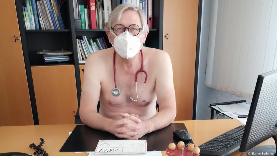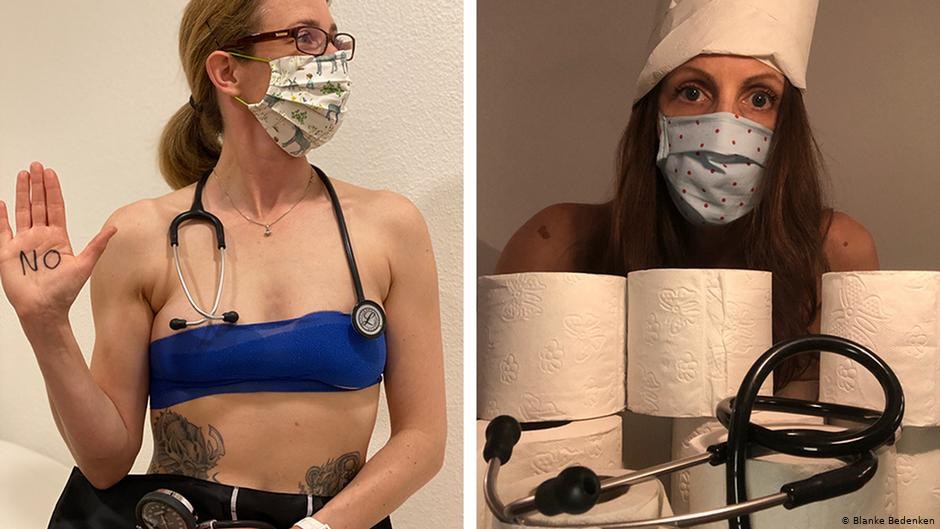 Έτσι και οι Γερμανοί γιατροί πόζαραν μέσα ή έξω από τα ιατρεία τους γυμνοί ή μόνο με μάσκες, στηθοσκόπια ή μηχανήματα που μετράνε την πίεση. Εντελώς γυμνοί δεν ήταν πάντως. Οι ευαίσθητες περιοχές καλύπτονταν από ένα τραπέζι, μια καρέκλα ή κάτι άλλο. Το κείμενο που συνοδεύει τις φωτογραφίες γράφει: «Όταν μας τελειώσουν και τα λίγα που διαθέτουμε, τότε θα μείνουμε έτσι». Χωρίς προστασία νιώθουν ευάλωτοι.