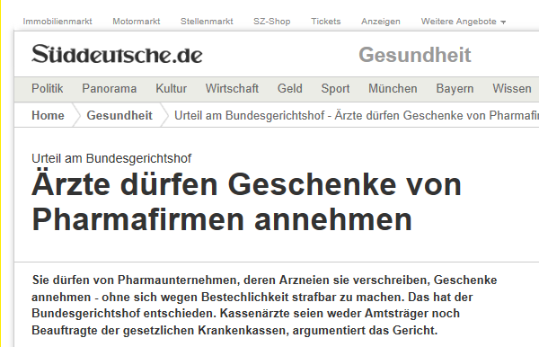 Οι Γερμανοί γιατροί που είναι συμβεβλημένοι με το εθνικό σύστημα υγείας της χώρας τους έχουν τη δυνατότητα να αποδέχονται χάρες, δώρα, ή και ακόμα και διακοπές από φαρμακευτικές εταιρίες που έχουν αξία ως και 10.000 ευρώ χωρίς να διλωκονται για διαφθορά.Αυτή την απόφαση έλαβε το Ομοσπονδιακό Δικαστήριο της Γερμανίας. Συγκεκριμένα το δικαστήριο απεφάνθη ότι οι ιατροί οι οποίοι έχουν συμβληθεί με το αντίστοιχο γερμανικό ΕΣΥ, δεν μπορούν να υπάγονται στο δικαιακό πλαίσιο που διέπει τη συμπεριφορά των δημοσίων λειτουργών σε ό,τι αφορά τη σχέση τους με τις φαρμακευτικές εταιρίες. Αυτό σημαίνει ότι δεν μπορούν να διωχθούν από το δικαστικό σύστημα εάν συνταγογραφούν φάρμακα εταιριών που τους προσφέρουν διάφορες χάρες και δώρα.