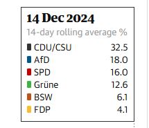 Ο Φρίντριχ Μέρτς, ηγέτης των Χριστιανοδημοκρατών, που είναι το ισχυρότερο κόμμα με 32% βάσει των σημερινών δημοσκοπήσεων, συμπεριφέρεται ήδη ως ο μελλοντικός καγκελάριος, υπαγορεύοντας πιθανούς όρους για τον σχηματισμό ενός μεγάλου συνασπισμού στο SPD, αλλά και στους Πράσινους, παρουσιάζοντας τον εαυτό του ως τον καλύτερο άνθρωπο.