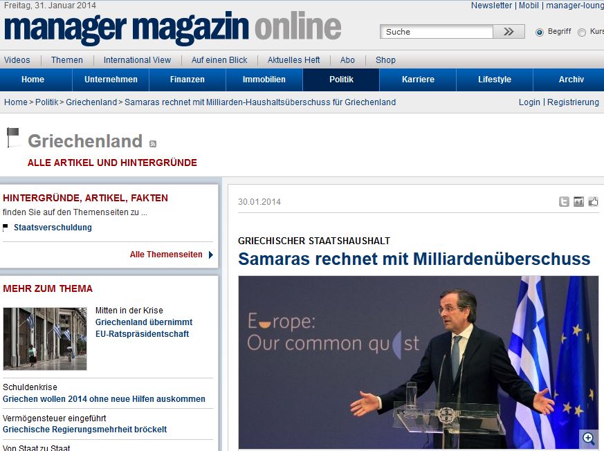«Η υπερχρεωμένη Ελλάδα πέτυχε, σύμφωνα με τα λεγόμενα του Πρωθυπουργού Αντώνη Σαμαρά, το 2013, ένα πλεόνασμα δισεκατομμυρίων στον κρατικό προϋπολογισμό. Ένα πρωτογενές πλεόνασμα -στον υπολογισμό του οποίου δεν περιλαμβάνεται το κόστος για την εξυπηρέτηση του χρέους- αποτελεί προϋπόθεση για νέες δανειακές βοήθειες των Ευρωπαίων εταίρων και του ΔΝΤ. Προηγουμένως , το βάρος των τοκοχρεολυσίων κρατούσε τον προϋπολογισμό σε αρνητικό πρόσημο. Το σχέδιο των πιστωτών όμως, προέβλεπε πλεόνασμα της τάξεως του ενός δισεκατομμυρίου ευρώ μόλις γι’ αυτό το χρόνο» επισημαίνει το «Manager Magazine» ενώ, αναφερόμενο στις εκτιμήσεις του ΙΟΒΕ, κάνει λόγο για «κάπως πιο φωτεινές προβλέψεις» για την οικονομία.