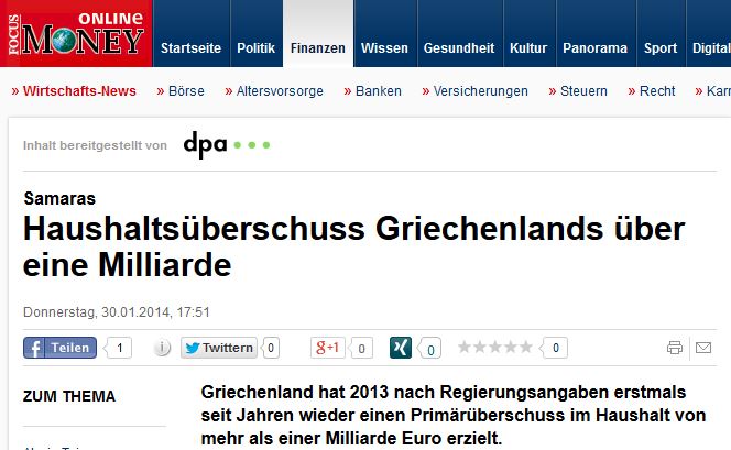Στο ίδιο θέμα αναφέρεται και το περιοδικό «Focus», το οποίο στην ηλεκτρονική του έκδοση δημοσιεύει ρεπορτάζ με τίτλο «Ελληνικό δημοσιονομικό πλεόνασμα άνω του ενός δισεκατομμυρίου» και υπότιτλο «Η Ελλάδα, σύμφωνα με στοιχεία της κυβέρνησης, για πρώτη φορά εδώ και χρόνια πέτυχε πάλι ένα πρωτογενές πλεόνασμα στον προϋπολογισμό, μεγαλύτερο του ενός δισεκατομμυρίου ευρώ». Σημειώνει δε, ότι σύμφωνα με δηλώσεις του Πρωθυπουργού Αντώνη Σαμαρά, το 70% του πλεονάσματος θα διατεθεί τα επόμενα χρόνια για την υποστήριξη εκείνων που υπέφεραν περισσότερο από τις συνέπειες του προγράμματος λιτότητας και παραθέτει δηλώσεις του κ. Σαμαρά, σύμφωνα με τις οποίες, «το πλεόνασμα προέρχεται από το αίμα του ελληνικού λαού και στον ελληνικό λαό θα επιστραφούν αυτά τα χρήματα».