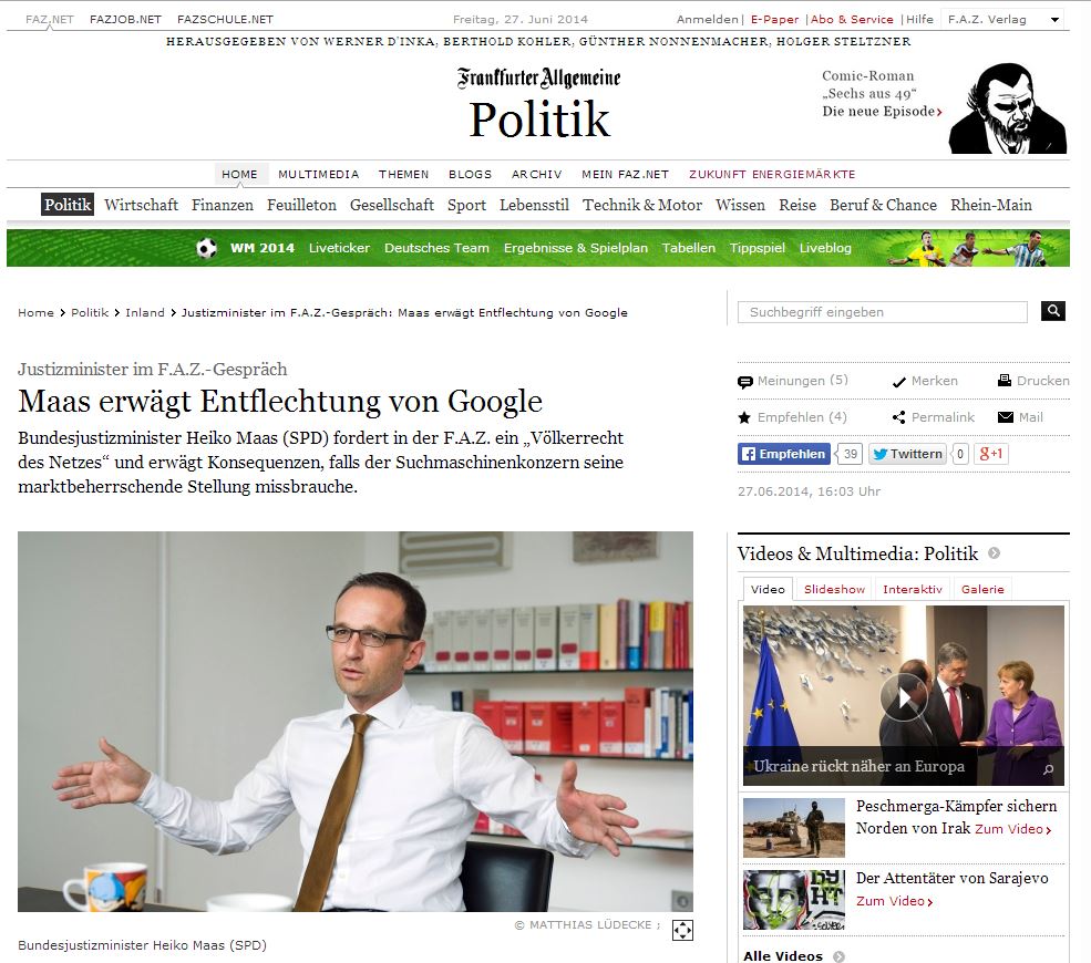 Ο υπουργός Δικαιοσύνης της Γερμανίας, Χάικο Μάας, αναφέρθηκε κατά τη διάρκεια μιας συνέντευξης που θα δημοσιευθεί αύριο, Σάββατο, στο ενδεχόμενο να κλείσει η Google, κι έγινε ο τελευταίος κατά σειρά Γερμανός υπεύθυνος που επιτίθεται εναντίον του Αμερικανικού κολοσσού του Διαδικτύου.