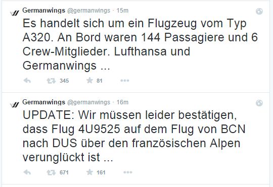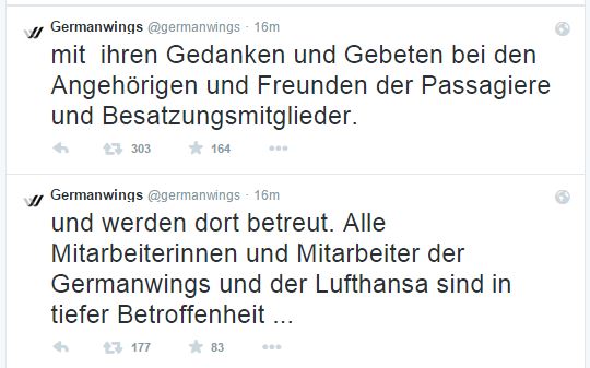 Με νεότερα tweets η αεροπορική εταιρεία Germanwings, έρχεται να επιβεβαιώσει την πληροφορία για τη συντριβή του αεροσκάφους, διευκρινίζοντας ότι επέβαιναν 144 επιβάτες ενώ τα μέλη του πληρώματος ήταν 6.