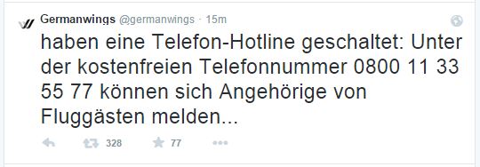 Η Lufthansa και η Germanwings δίνει σε επόμενο tweet της έναν τηλεφωνικό αριθμό (080011335577) στον οποίο μπορούν να καλούν οι συγγενείς των θυμάτων…