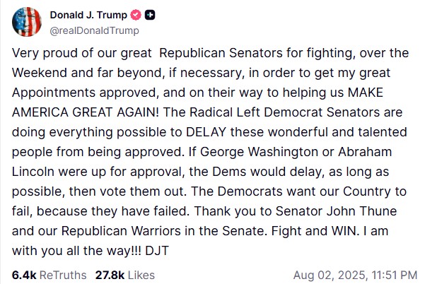 Με ανάρτηση στο Truth Social το Σάββατο ο Αμερικανός πρόεδρος τα έβαλε με τους Δημοκρατικούς επειδή «κάνουν ό,τι είναι δυνατόν για να ΚΑΘΥΣΤΕΡΗΣΟΥΝ την έγκριση αυτών των υπέροχων και ταλαντούχων ανθρώπων».