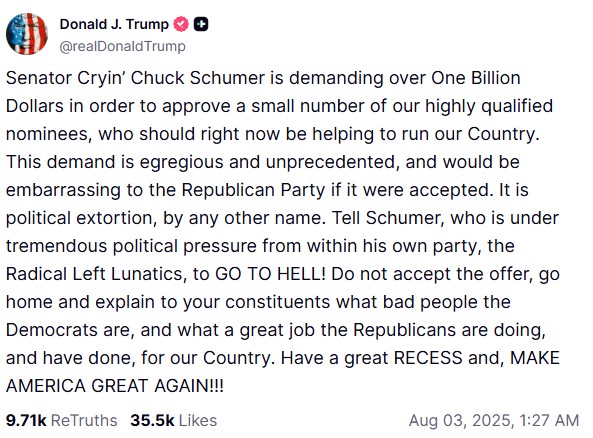 Με νέα ανάρτηση του ο Ντόναλντ Τραμπ επιτέθηκε προσωπικά στον Τσακ Σούμερ για το αδιέξοδο. «Ο γερουσιαστής ‘κλαψιάρης’ Τσακ Σούμερ απαιτεί πάνω από ένα δισεκατομμύριο δολάρια προκειμένου να εγκρίνει έναν μικρό αριθμό υποψηφίων μας με υψηλά προσόντα, οι οποίοι θα έπρεπε αυτή τη στιγμή να βοηθούν στη διακυβέρνηση της χώρας μας. Αυτή η απαίτηση είναι εξοργιστική και χωρίς προηγούμενο και θα ήταν ντροπιαστική για το Ρεπουμπλικανικό Κόμμα αν γινόταν δεκτή. Πρόκειται για πολιτικό εκβιασμό», έγραψε ο Ντόναλντ Τραμπ.