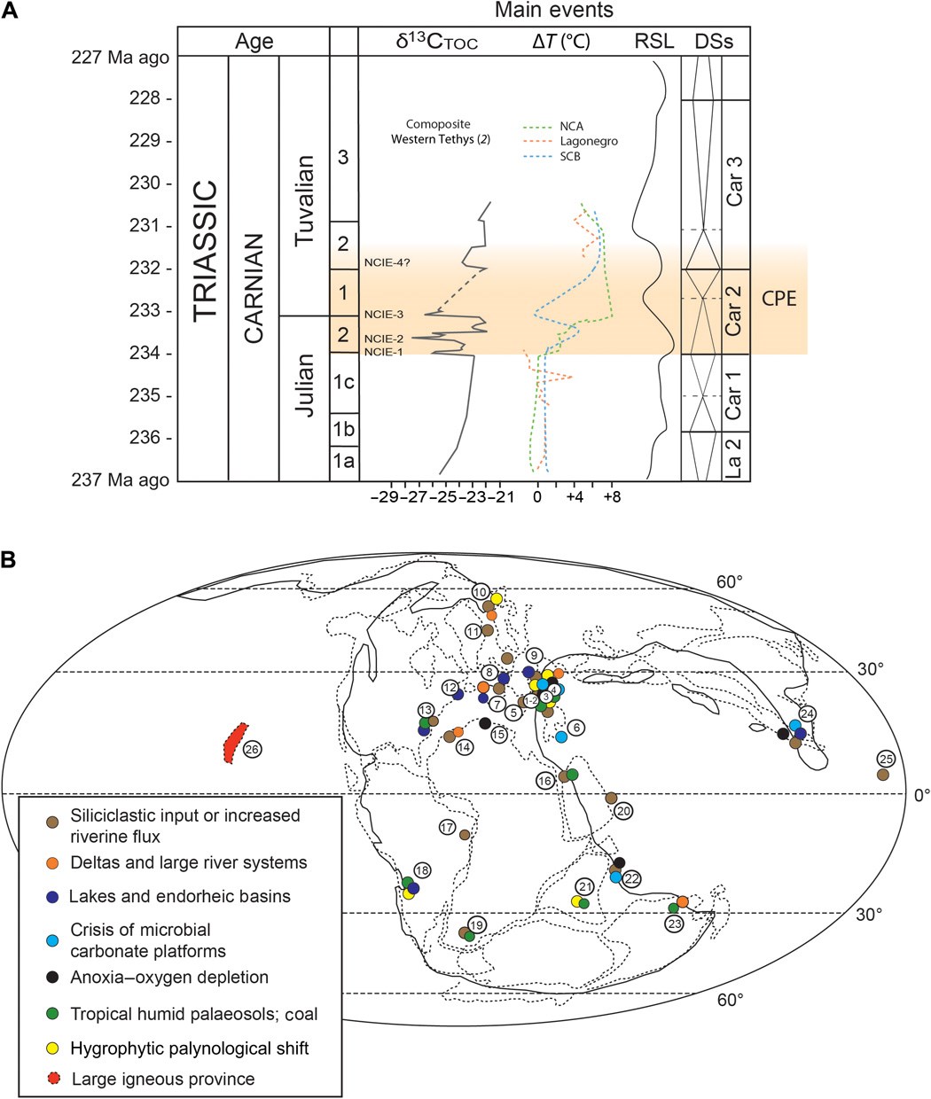 Πριν από 233 εκατομμύρια χρόνια στη Γη συντελέστηκε μία, άγνωστη έως σήμερα, μαζική εξαφάνιση των ειδών, ίχνη της οποίας ανακάλυψε μια διεθνής επιστημονική ομάδα. Αυτό το γεγονός που φέρει την επιστημονική ονομασία Carnian Pluvial Episode κατά την Ύστερη Τριασική περίοδο, μεταξύ άλλων, διευκόλυνε την κυριαρχία των δεινοσαύρων στον πλανήτη μας, σύμφωνα με τους ερευνητές, οι οποίοι με επικεφαλής τον παλαιοντολόγο Μάικ Μπέντον της Σχολής Γεωεπιστημών του βρετανικού Πανεπιστημίου του Μπρίστολ, αξιολόγησαν μια σειρά από γεωλογικά και παλαιοντολογικά δεδομένα και έκαναν τη σχετική δημοσίευση στο περιοδικό «Science Advances».