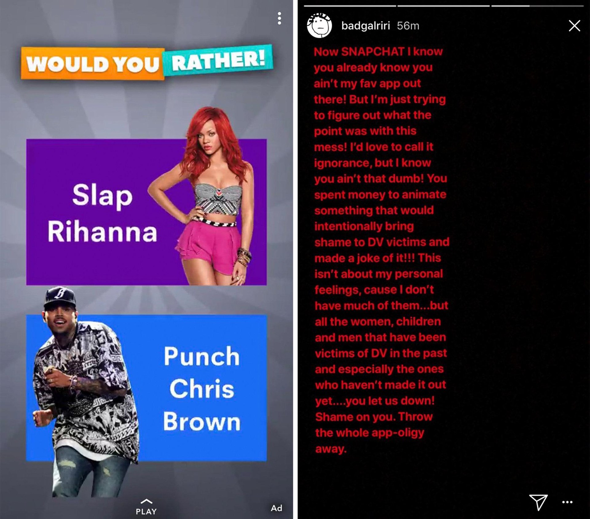 Συγγνώμη ζήτησε ο ιστότοπος κοινωνικής δικτύωσης Snapchat, καθώς ανήρτησε μια διαφήμιση για ένα παιχνίδι, το οποίο προτείνει στους χρήστες να «χαστουκίσουν τη Ριάνα». Νωρίτερα, η δημοφιλής τραγουδίστρια, η οποία έχει πέσει θύμα κακοποίησης από τον σύντροφό της, ζήτησε από τους θαυμαστές της να διαγράψουν την εφαρμογή.