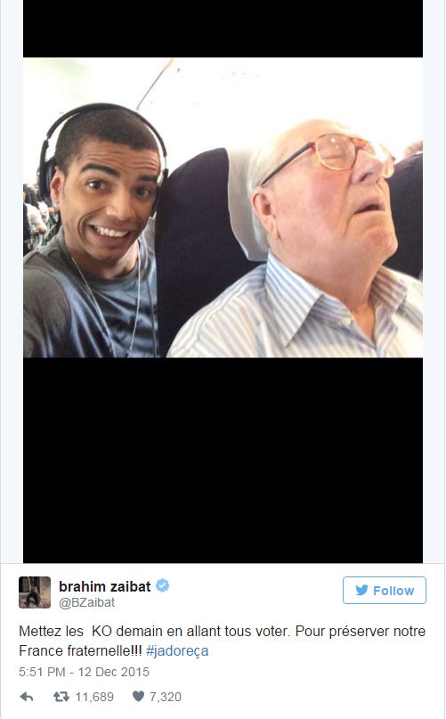 «Ας ψηφίσουμε όλοι αύριο για να τους αποτρέψουμε. Για να διατηρηθεί η αδελφική Γαλλία» ήταν το μήνυμα που έγραψε στη λεζάντα της φωτογραφίας ο Μπραχίμ Ζαϊμπάτ.
